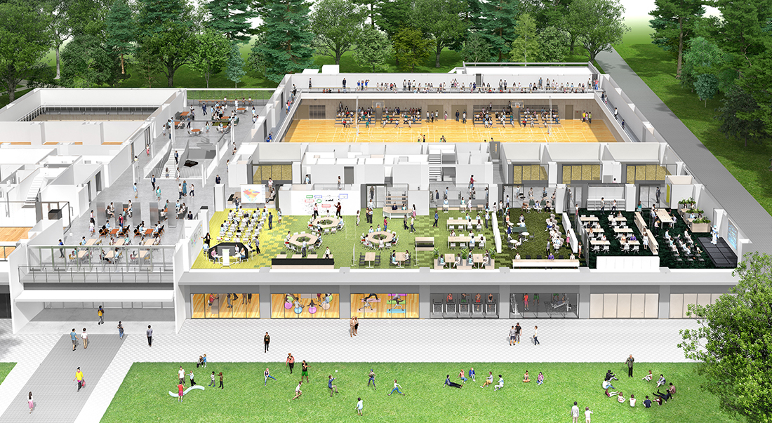 キャンパス中央にカフェテリア・購買施設を移転し、単なる食事の場を超えたコミュニティハブとしての役割を果たす「拠点」に整備していきます。