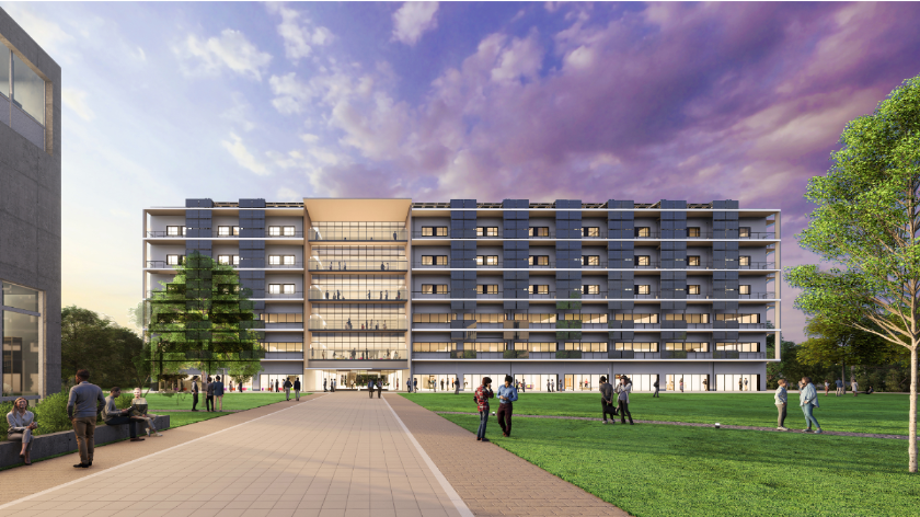 新校舎の名称は9号館「創発棟」、その前に整備される広場は「創発広場」。