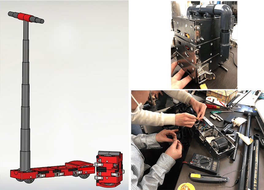 機械力学、材料力学、機構学、加工工学などの知識を基に、複数の部品から構成される機械装置の設計を実際に行い、ものづくり工学実習や機械基礎製図などの知識を用いて設計できる能力を身につけます。