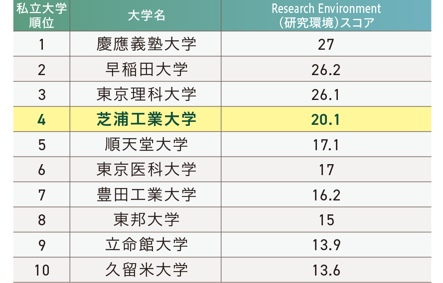 9月27日にTHE World University Rankings*(世界大学ランキング)が発表されました。本学は、5つある評価分野の一つ「Research En vironment(研究環境)」のスコアにおいて、日本の大学全体の25位、私立大学の4位に、「International Outlook(国際性)」は国内19位、私立大学の6位という結果になりました。