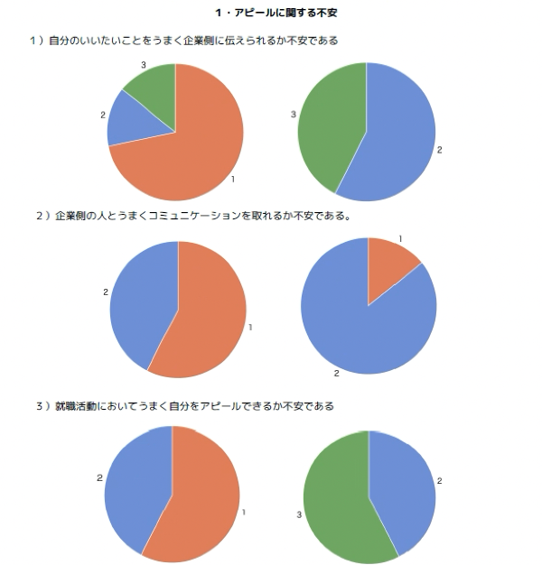 言いたいことが伝えられるか、アピールできるか、などについての不安が減少していることからも、企業が望んでいることは一定程度理解が出来た(実際に自分がうまく対応できるかは別として)ということを表していると思われます。本年度「コミュニケーションがうまく取れるか」についての数値が低いのは、模擬面接後に実施したゲストから一人ひとりが丁寧なフィードバックを貰う時間を設けることができたことに関連していると思われます。